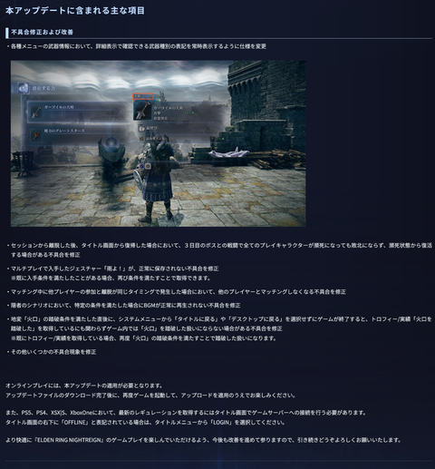| 『エルデンリング ナイトレイン』さっそくアプデを予告。シングルプレイにおける調整と不具合修正 …NIGHTREIGN(エルデンリング ナイトレイン)』に関し、アップデートを予告しました。 来週中に配信予定アップデートでは、不具合修正と、シングルプレイ… (出典:Game Spark) |
