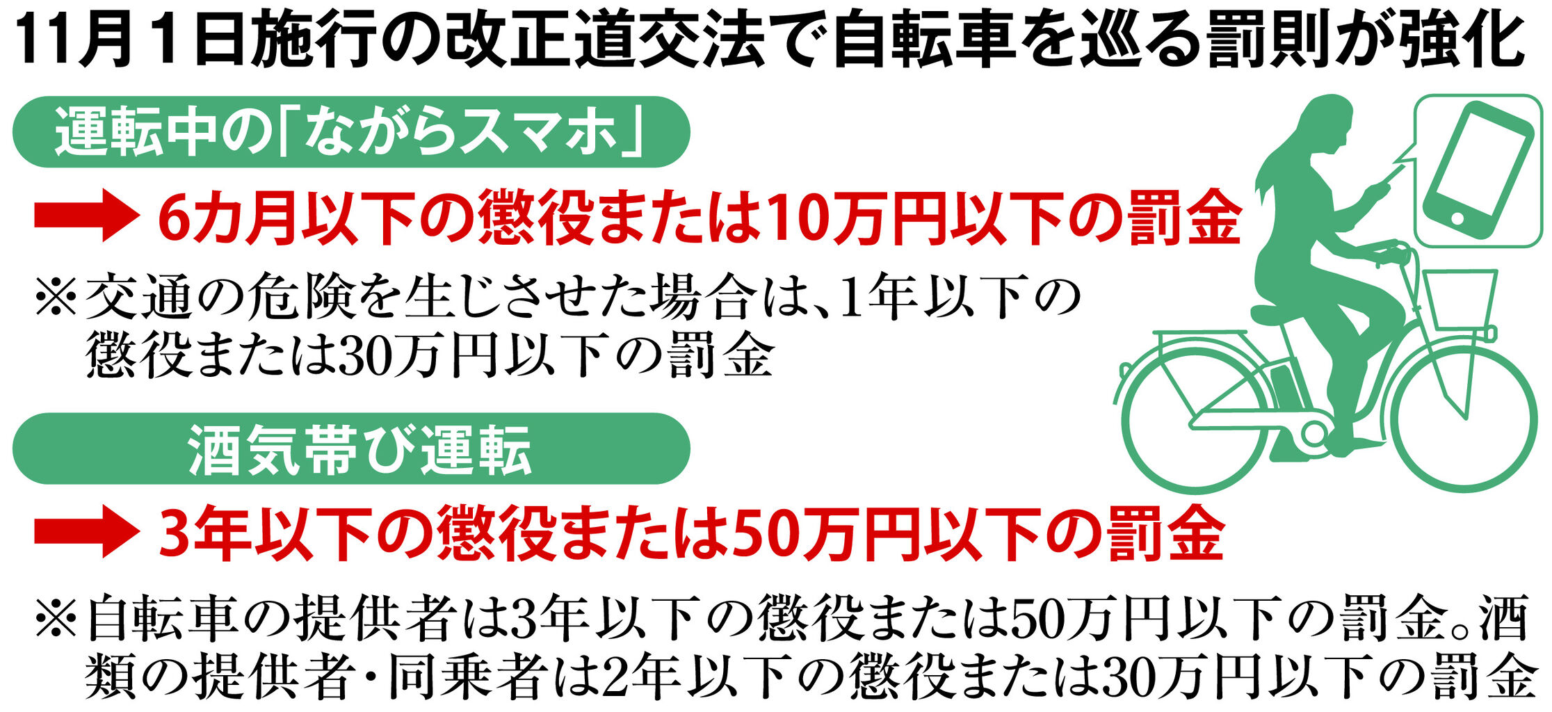 @livedoornews【本日から】自転車「ながら運転」罰則対象に スマホ使用で懲役や罰金も news.livedoor.com/article/detail… きょう11月1日から自転車を運転する際の「携帯電話の使用」「酒気帯び」の2種類が、危険な行為として厳罰化される。携帯電話の使用は、事故を起こさなくても6カ月以下の懲役か10万円以下の罰金となる。 pic.x.com/tmgAgTjvlP